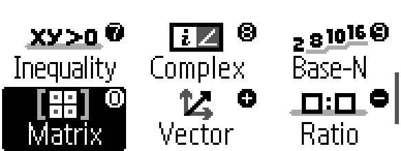 먼저 메뉴 아이콘에 단축키가 (다시) 생겼습니다. 예를 들어 HOME 을 누르고 0 을 누르면 행렬 계산 메뉴로, 8 을 누르면 복소수 계산 메뉴로 바로 들어갈 수 있습니다.