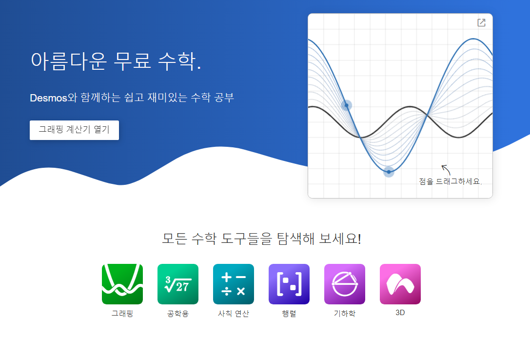 우선 Desmos를 검색하여 Desmos 웹사이트로 들어갑니다. 여러 가지 수학 도구들이 있는데 이 중 그래핑은 2차원 평면에서, 3D는 3차원 공간에서 그래프를 그릴 수 있는 도구입니다. 3D를 선택합니다.