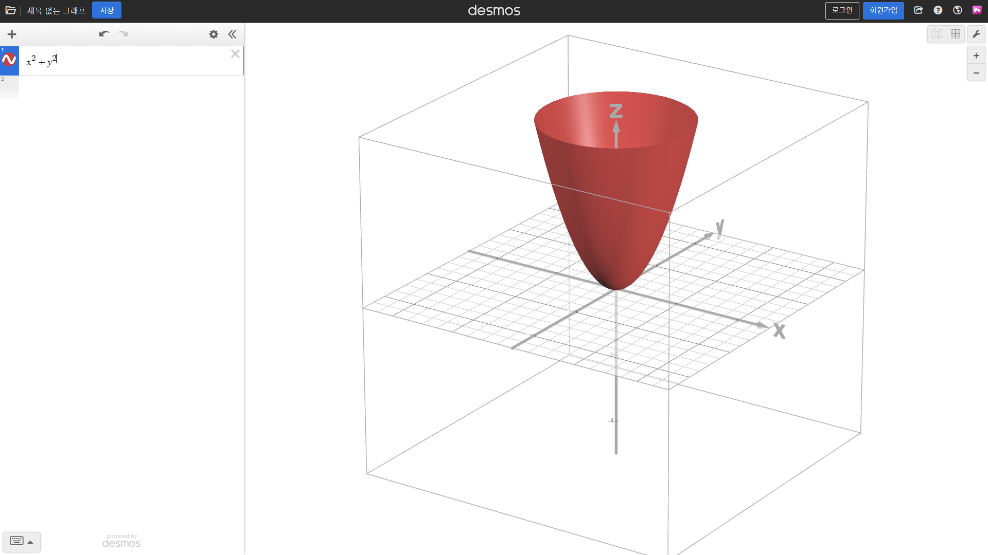이제 그래프를 그려 봅시다. $z=f(x,y)$ 꼴로 표현되는 함수는 $z=$를 빼고 $f(x,y)$만 입력해도 됩니다. $z=x^2+y^2$을 입력해 봅시다. 제곱은 ^2
