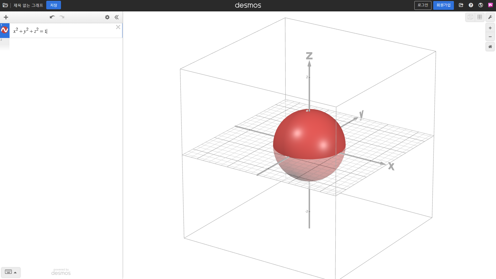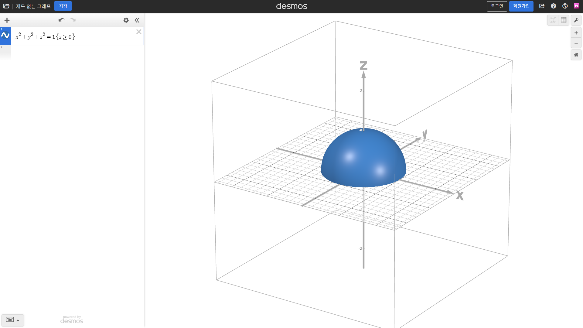 그래프를 그릴 때 특정 변수의 값을 제한할 수도 있습니다. 예를 들어 위에서 입력해 본 구 $x^2+y^2+z^2=1$을 $z\geq 0$인 범위에서 그리려면 아래와 같이 중괄호 안에 범위를 넣어 주면 됩니다.