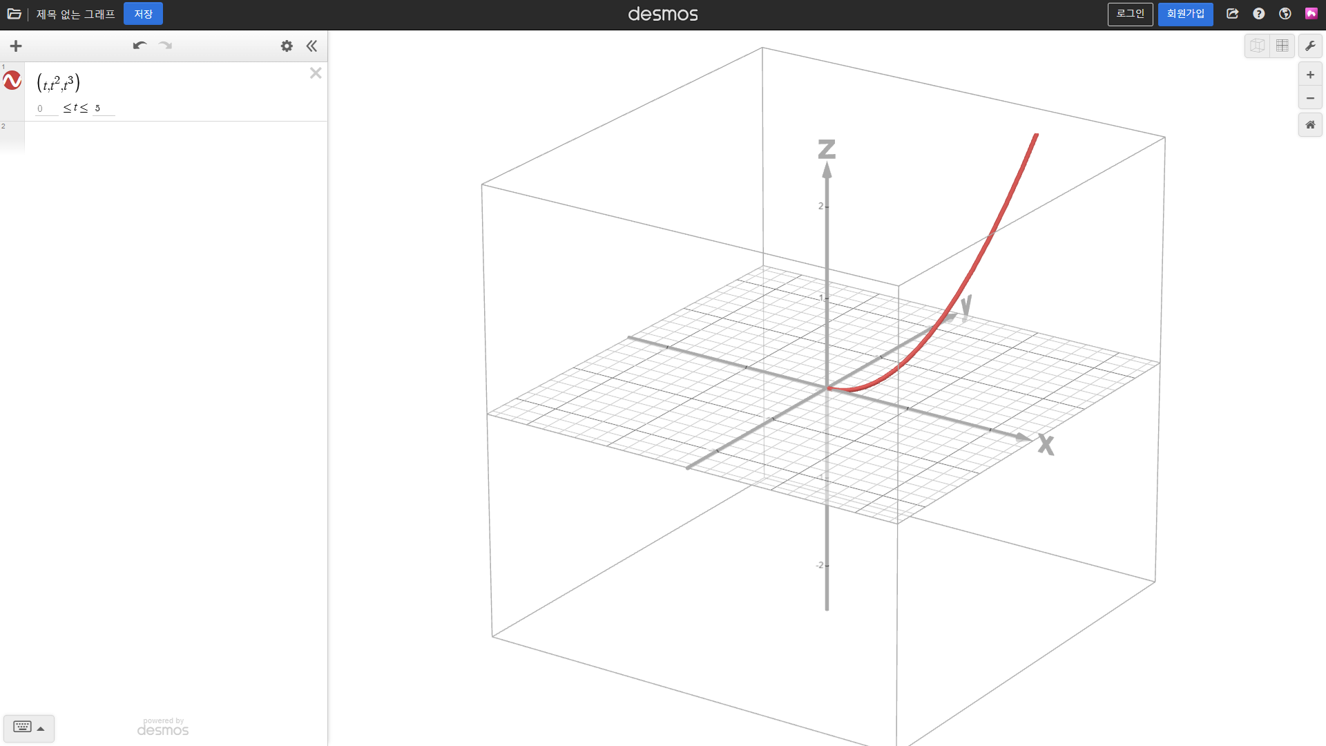 $\textbf{r}(t)=\langle t, t^2, t^3 \rangle (0\leq t \leq 5)$을 그려 봅시다. 아래와 같이 입력하면 됩니다. $t$의 범위도 아래에서 설정할 수 있습니다.