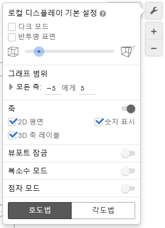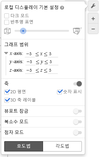 이 중 중요한 건 범위 설정 뿐입니다. 모든 축에 값을 집어넣으면 x, y, z축의 범위를 동시에 설정할 수 있습니다. 번역이 이상하게 되어 있지만 위와 같이 -5 에게 5처럼 설정되어 있다면 설정된 그래프의 범위는 $-5 \leq x \leq 5, -5 \leq y \leq 5, -5 \leq z \leq 5$가 됩니다.