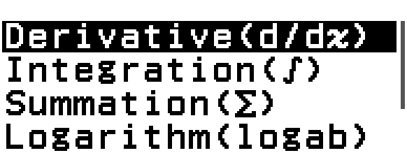 먼저 CATALOG 를 누릅니다. 그런 다음 Func Analysis 메뉴로 들어가면 미분(Derivative)과 적분(Integration), 수열의 합(Summation) 등을 입력할 수 있습니다.