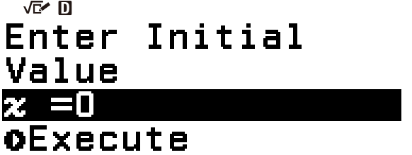 방정식을 모두 입력하고 EXE 를 누르면 Enter Initial Value라는 화면이 뜹니다. 이 화면에 나온 수는 방정식의 해가 아닙니다.