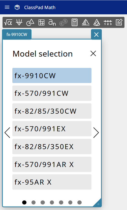 아래에 있는 버튼들을 클릭하면 계산기 모델을 바꾸거나 계산기 화면 스크린샷을 찍을 수 있습니다. 바꿀 수 있는 계산기 모델 종류는 Classwiz 시리즈들입니다. 예를 들어서 fx-570CW, fx-570EX, fx-350EX 등의 계산기를 사용할 수 있습니다. 모델명이 비슷한 다른 계산기들은 우리나라에는 판매되지 않고 다른 국가에서 판매되는 계산기입니다.