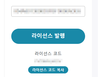 ID를 입력하고 라이선스 발행 버튼을 누르면 아래에 라이선스 코드가 나옵니다. 라이선스 코드 복사 버튼을 눌러 라이선스 코드를 복사합니다.