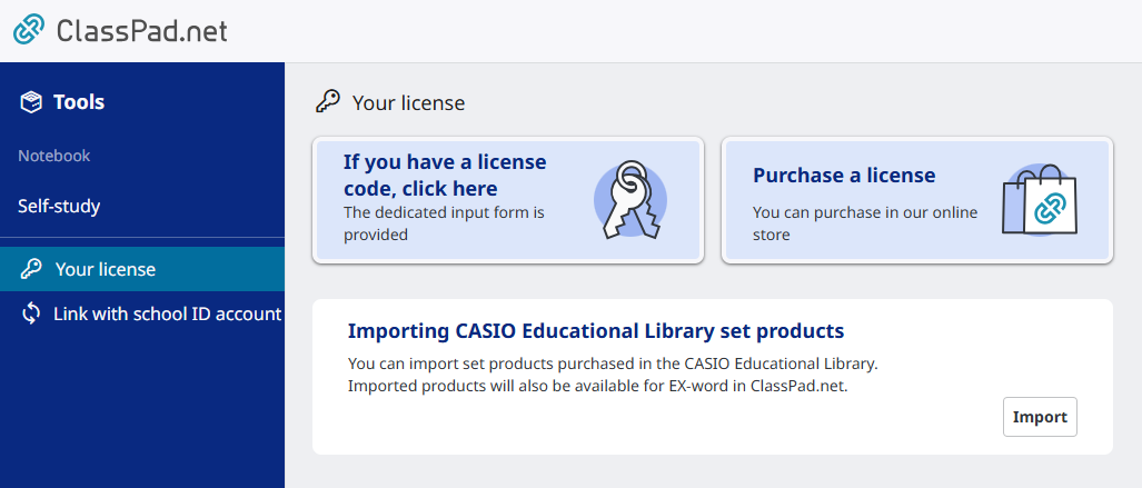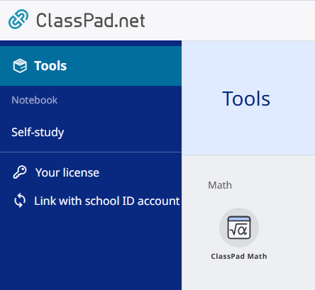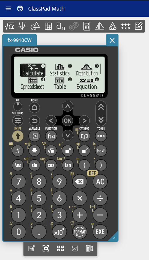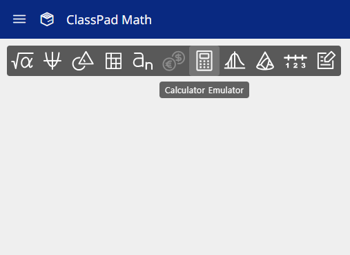 왼쪽 메뉴에서 Tools를 선택한 후 ClassPad Math를 클릭하면 아래와 같은 화면이 뜹니다. Calculator Emulator 아이콘을 선택하면 계산기 에뮬레이터를 켤 수 있습니다.